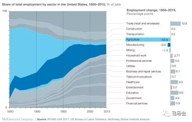 从上图可以看到,历经两次工业革命后,农业、制造业和矿业的就业人数有明显减少,但在贸易、教育和医护行业就业的人数明显增多。