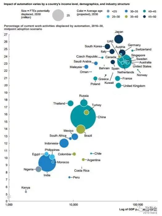 △ 圆圈大小代表可能流失的全职人力工时(FTE),颜色代表人员平均年龄,横轴为2030年人均国内生产总值,纵轴为被取代的岗位占比