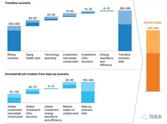 麦肯锡预计,在经济增长充分、创新和投资充足的情况下,新创造的就业机会足以抵消自动化带走的岗位损失。并且在一些发达经济体中,我们将需要额外的投资减少劳动力短缺的风险。