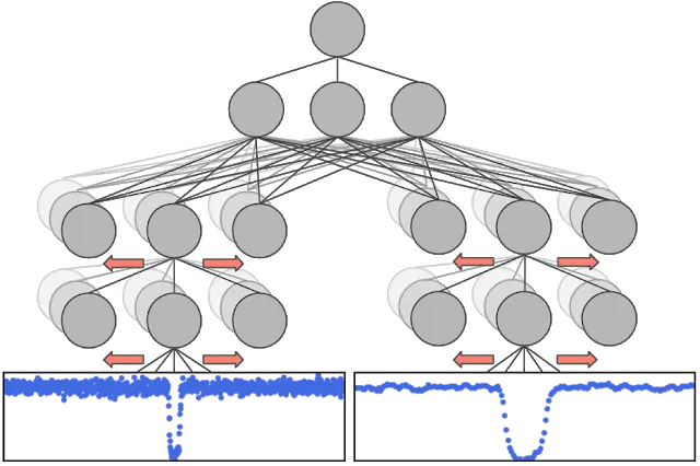 我们来看一下今天发布的代码怎样帮助(重新)发现 Kepler-90 i 行星。第一步是按照代码首页上的说明训练模型。下载并处理开普勒望远镜的数据需要一段时间,但是在这个过程完成后,训练模型和根据新信号进行预测就会相对较快了。一种用于查找要向模型显示的新信号的方式是使用 边界框最小二乘 (BLS) 算法,这种算法会搜索亮度的周期性“框型”下沉(参见下图)。BLS 算法将检测要向模型显示的“U”形行星信号、“V”形联星信号和许多其他类型的误报信号。BLS 算法存在各种免费的软件实现,包括 VARTOOLS 和 LcTools。或者,您甚至还可以像 行星猎人一样,用肉眼查找候选行星凌日。