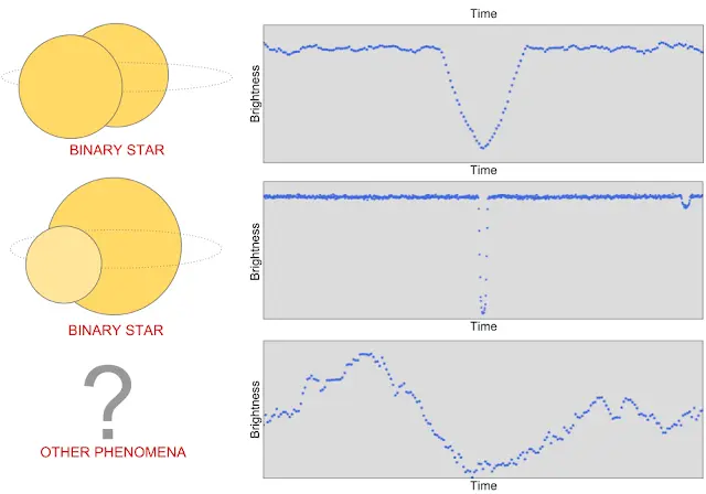 不过,其他天文和仪器现象也可能导致恒星的测量亮度下降,包括联星系统、星斑、宇宙射线击中开普勒光度计,以及仪器噪声。