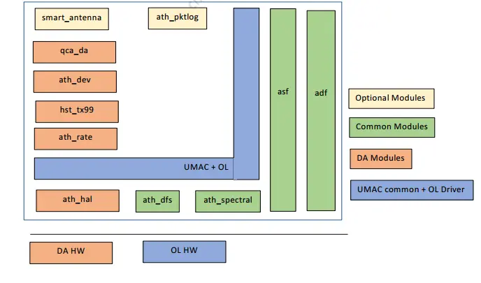 通用WLAN驱动模块用于Direct-Attach和Off-load芯片组。 asf.ko,qdf.ko,ath_dfs.ko,ath_spectral.ko和umac.ko这些,对于Direct-Attach和Off-load芯片组都是需要的