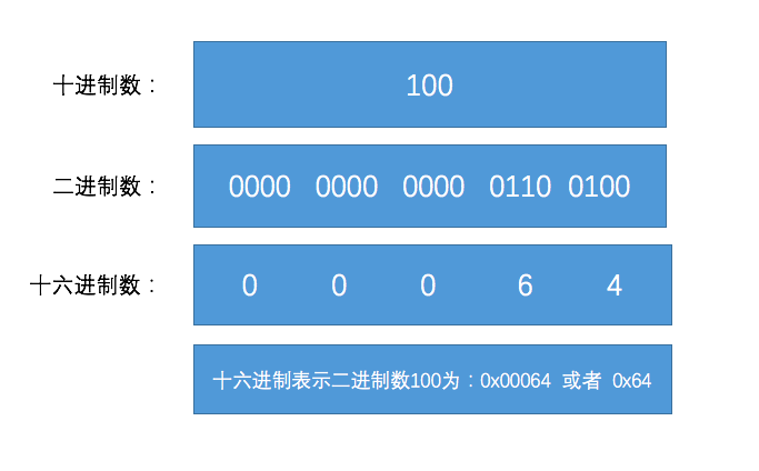 下图的整数100在三种进制中的表示: