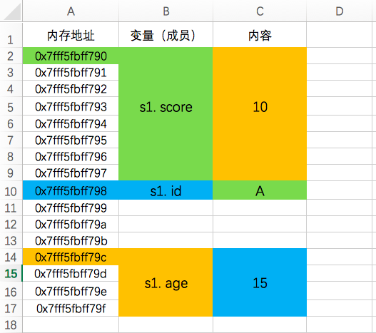 printf("%p\n",&s1.age); //0x7fff5fbff798