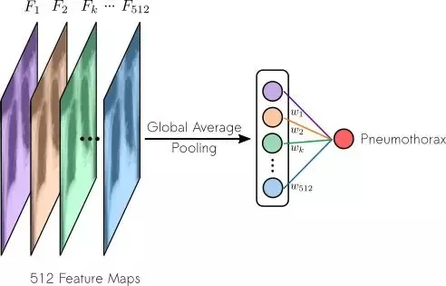 为了进行具体说明,我们让 F_k 代表 k-th 在卷积神经网络最后一个卷积层上的特征图,然后让 w_k 代表 k-th 在特征凸和全连接层上的权重。于是,用于气胸检测的类激活图为: