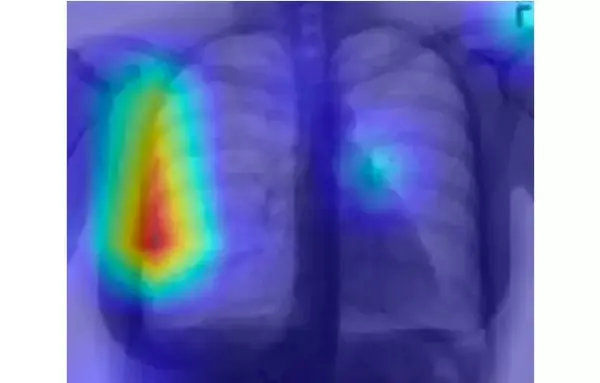 (feature_maps, dense_weights) = extract_features_weights(model)正如气胸阳性的胸透照片示例所展示的那样,CAM 最终可以可视化为一张热图。