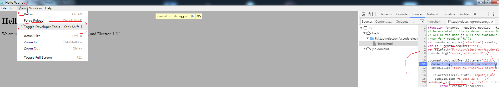 在上面的工程中用VSCode调试渲染进程是ok的,但尝试用webpack给代码打包后,发现在代码中设置的断点会停不了,所以接着介绍下面的另一种调试渲染进程的方法