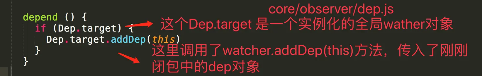 考验你闭包能力的时候到了,这个dep对象就是一个闭包。记下来我们看看dep.depend()方法的实现。