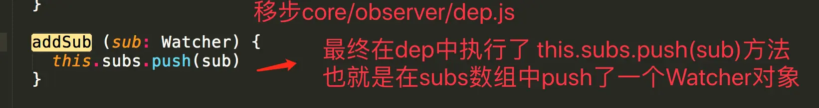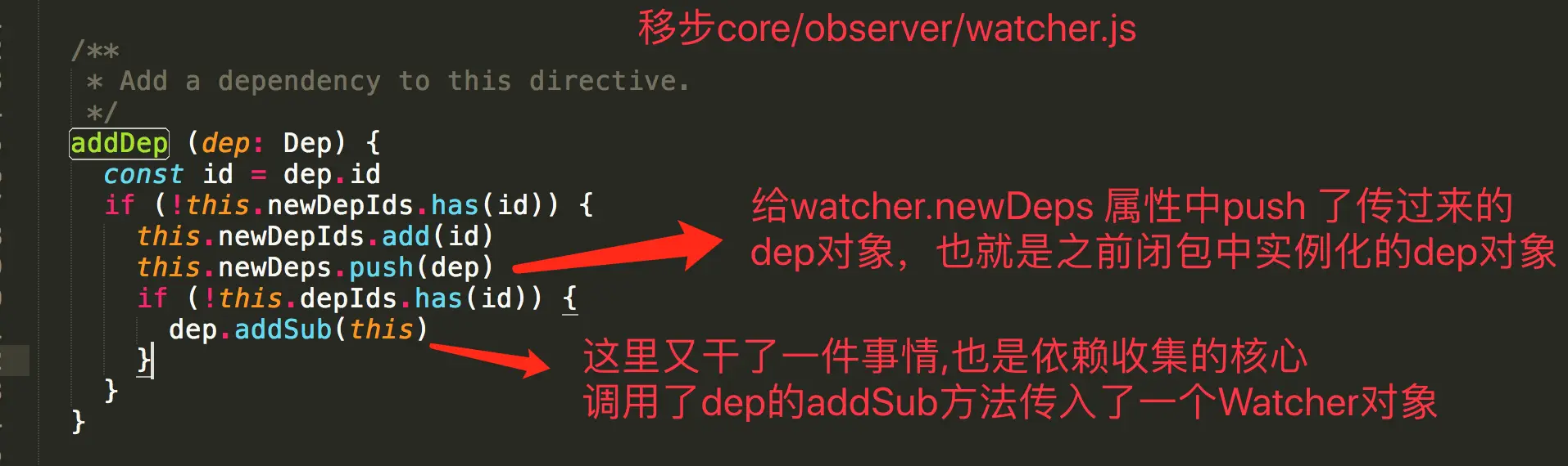 搞懂了Dep.target等于一个Watche对象,现在继续回到之前的思路看watcher.addDep做了什么。