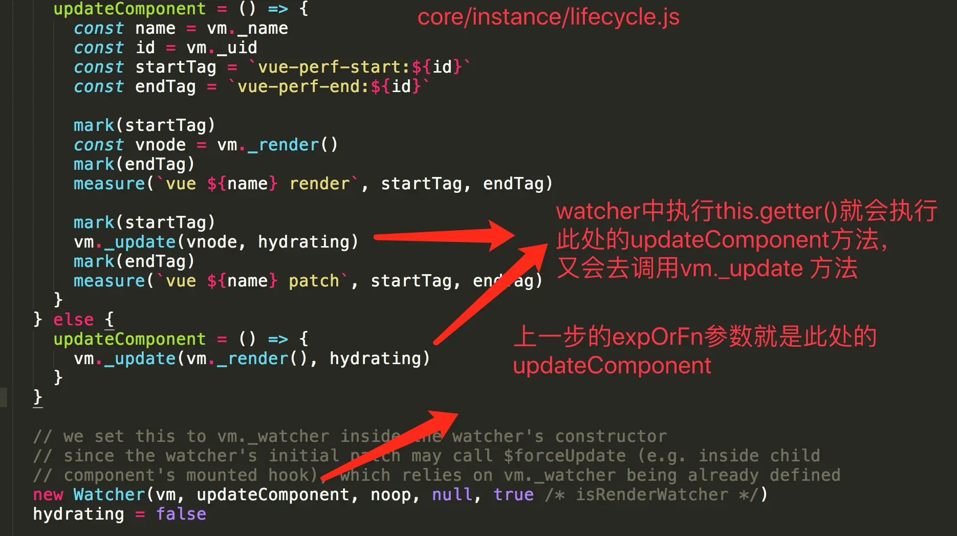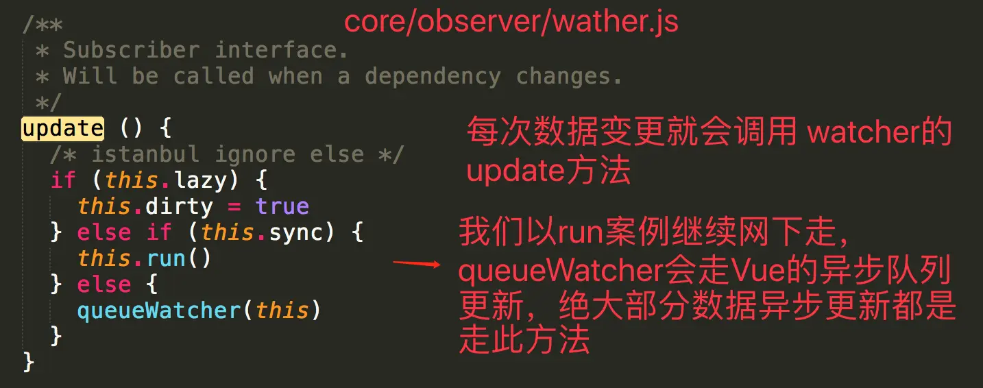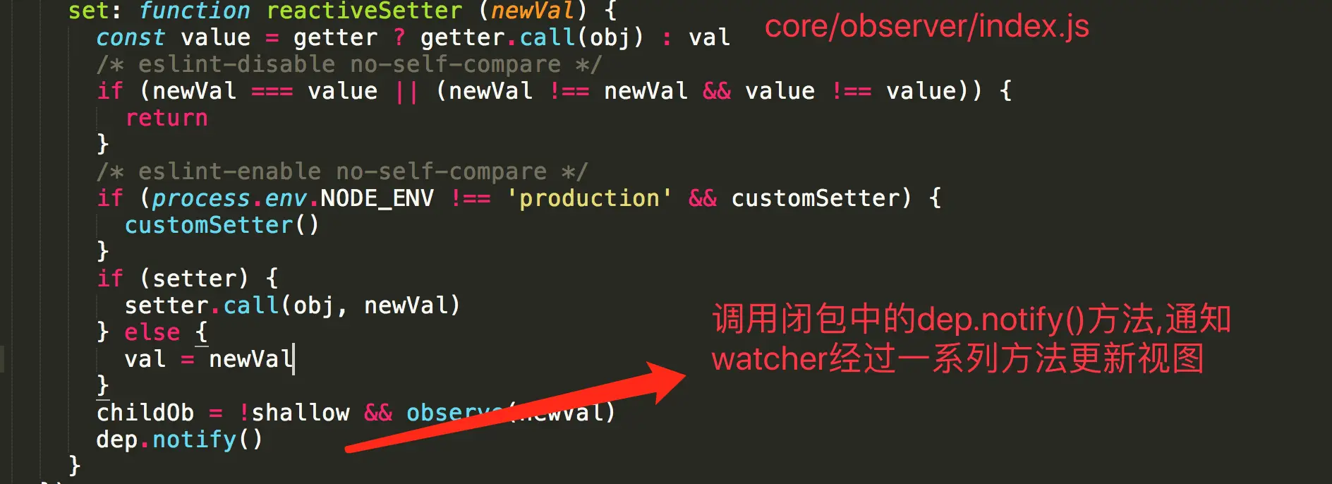 总结:依赖收集最终在 watcher.newDeps 中push了闭包中传过来的dep对象,在dep.subs中push了初始化Vue是简历的Watcher对象,这个对象的,this.getter = expOrFn,传过来的expOrFn是后期数据更新页面渲染的核心步骤,需要沉下心来好好去理理。
