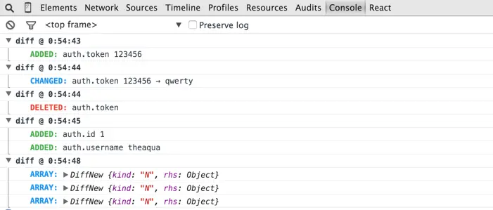 无论你是使用 console.log 打印 state,还是使用 debugger 启动 dev tools 审查、调试 state,你其实都是想捕捉 state 中前后 发生变化的值。Redux diff logger 正能肩负此任,它会打印出 state 中所有发生变化的值。