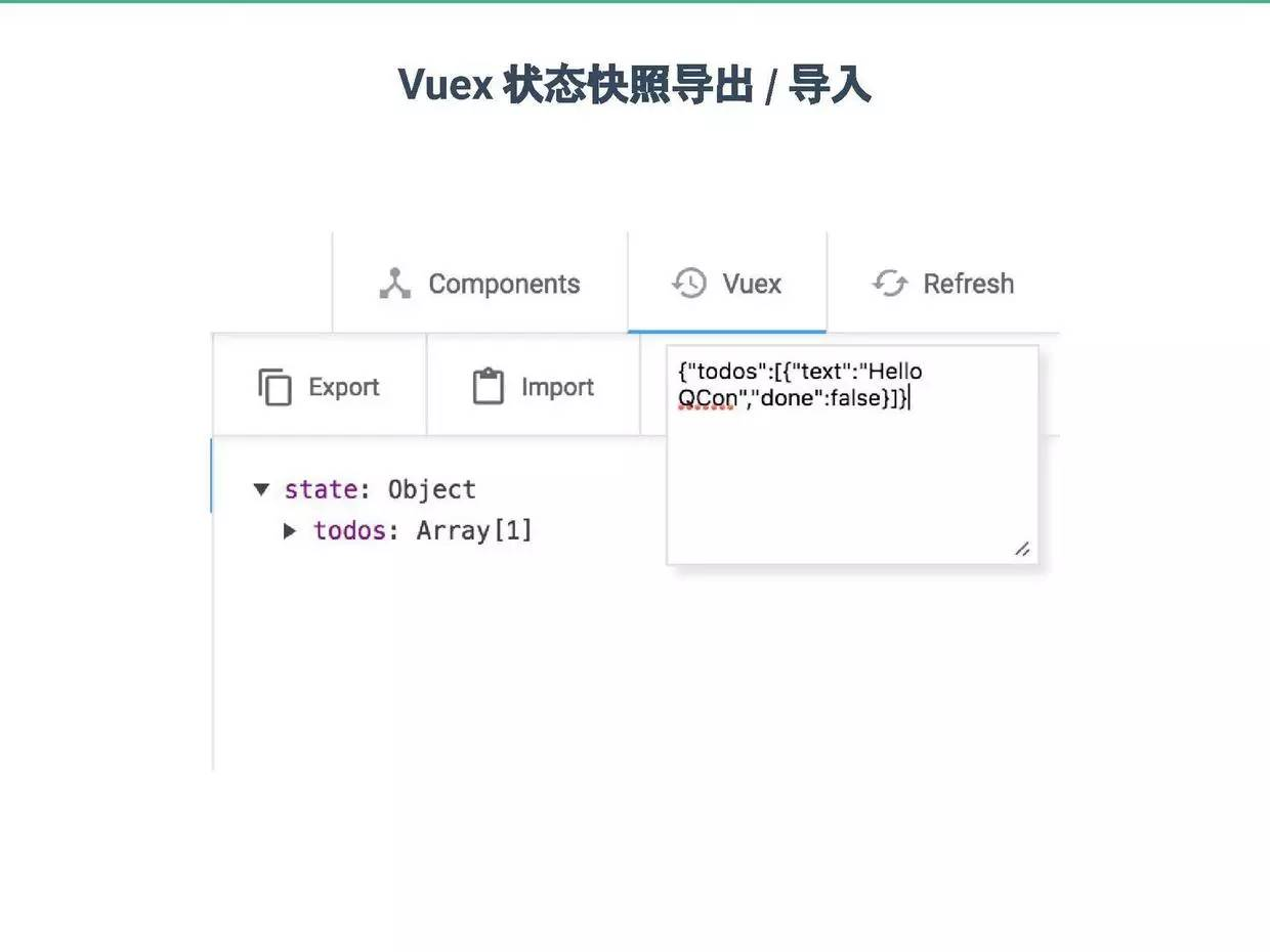 点击组件,就可以观察这个组件当前的状态。也可以把这个组件发送到控制台里。同时这个开发者工具还有一个 Vuex 面板,如果你用了 Vuex,那么每次操作都会被记录下来,记录下来的状态之间可以进行跳转。除此之外,还支持把当前应用的状态快照发送给另外一个人,这个人可以在他的控制台里导入你发送的状态,就可以立刻跳转到你之前所在的状态。这对于重现一些 bug,或要描述当前状态都很有帮助。