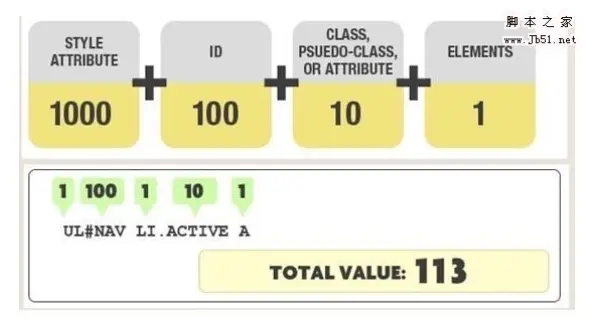 注意:通用选择器(*),子选择器(>)和相邻同胞选择器(+)并不在这四个等级中,所以他们的权值都为0。