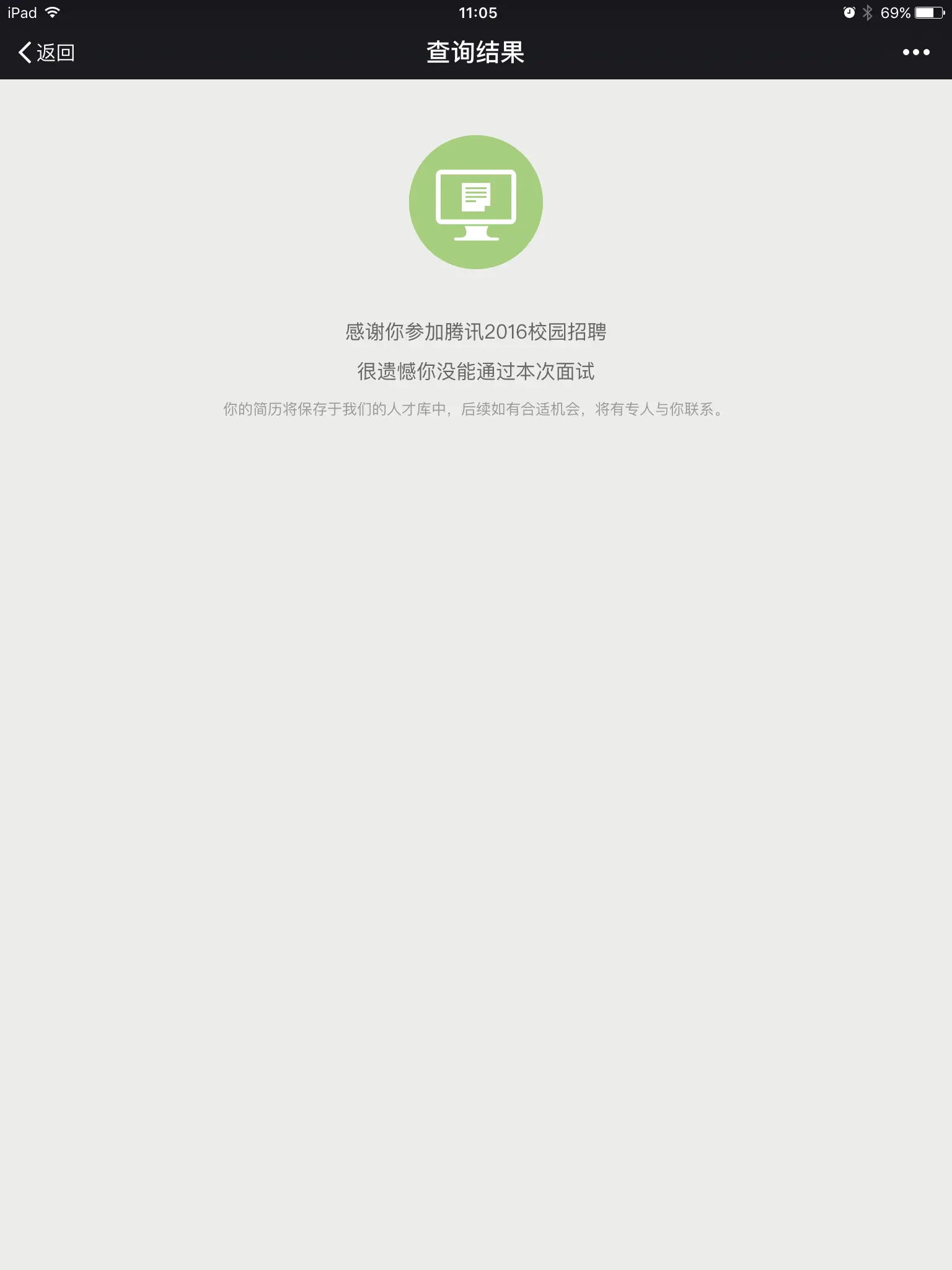 就这样结束了鹅厂校招的初试,回到深圳的时候已经晚上六点多了,什么都没想,等面试结果。第二天起来,在腾讯校招微信公众号上查询了一下面试结果。