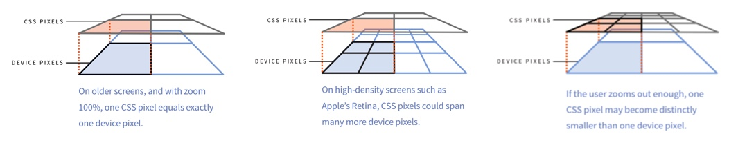 一般情况下,我们只需关心Css像素就可以,无需关心它的对应的设备像素。我们在Css 和Javascript代码中拿到的也基本上是Css像素,除了 screen.width/height。