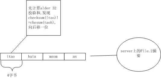 划分出itao、huia、msom、an,当然,这些串的Alder32值肯定无法从File.1里划分出的:taoh、uiis、soma、n找出相同的。于是向后移一个字节,从t开始继续按4字节划分。