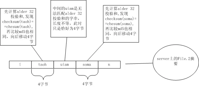 从taoh上找到了alder32相同的块,接着再比较MD5值,也相同!于是记下来,跳过taoh这4个字符,看uiam,又找不到File.1上相同的块了。继续向后跳1个字节从i开始看。还是没有找到Alder32相同,继续向后移,以此类推。