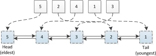 LRU算法实现原理参见他山之石中的《如何设计实现一个LRU Cache》。本质上是一个hashmap+双向链表,每次访问操作都将节点放在链表头部,尾部自然就是最旧的节点了。