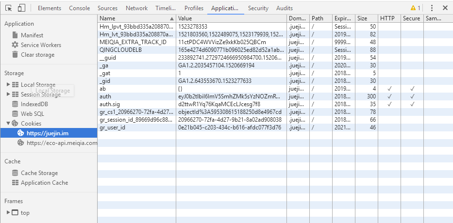 在chrome控制台中的Application选项卡中可以看到cookie的信息。