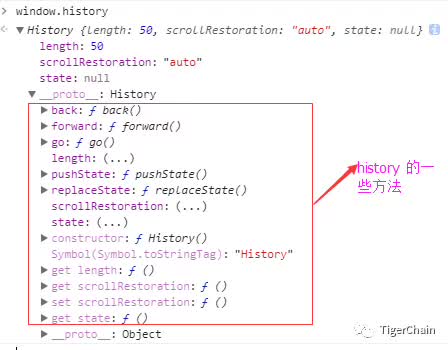 我们在 chrome 浏览器的调试窗口中在 Console 中输入 window.history,会得到 history 的一些方法和属性,如下图所示