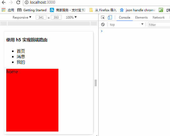 <h4>使用 h5 实现前端路由</h4> <ul> <li> <a onclick="home()">首页</a></li> <li> <a onclick="message()">消息</a></li> <li> <a onclick="mine()">我的</a></li> </ul> <div id="showContent" style="height:240px;width:200px;background-color:red"> home </div> <script type="text/javascript"> function home() { // 添加到历史记录栈中 history.pushState({name:'home',id:1},null,"?page=home#index") showCard('home') }; function message() { history.pushState({name:'message',id:2},null,"?page=message#haha") showCard('message') } function mine(){ history.pushState({ id:3, name:'mine' },null,"?name=tigerchain&&sex=man") showCard('mine') } // 监听浏览器回退 并且刷新到指定内容 window.addEventListener('popstate',function (event) { var content = ""; if(event.state) { content = event.state.name; } console.log(event.state) console.log("history 中的历史栈中的 name :"+content) showCard(content) }) // 此方法和上面的方法是一毛一样的,只是两种不同的写法而已 // window.onpopstate = function (event) { // var content = ""; // if(event.state) { // content = event.state.name; // } // showCard(content); // } function showCard(name) { console.log("当前的 hash 值是:"+location.hash) document.getElementById("showContent").innerHTML = name; } </script>