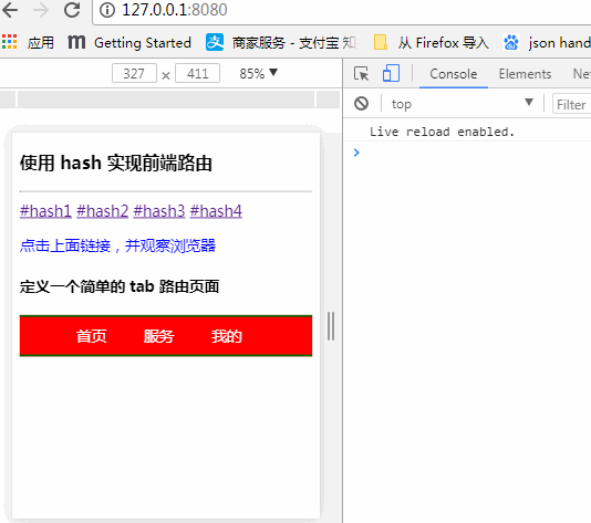 从图中我们可以看到,使用 hash 并不会导致浏览器刷新,并且我们 js 拿到了 hash 值并且打印出来了