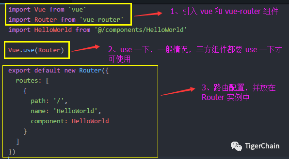 我们可以看到默认 vue-cli 创建的带路由的项目把 router 配置文件单独的写在了 router/index.js 文件中了,并且我们看到默认指定打开的是 HelloWorld 组件「想配置路由组件,引入组件配置即可」
