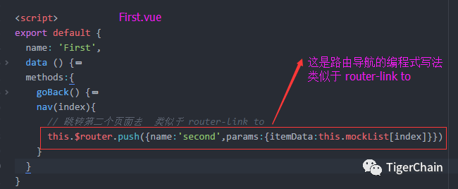 我们看到 / 对应的是 First 组件,/second 对应的是 Second 组件,并且分别给了 name 属性「在路由 push 的时候就可以使用到」,没什么好说的,当然你也可以不写 name 属性,路由跳转有几种写法