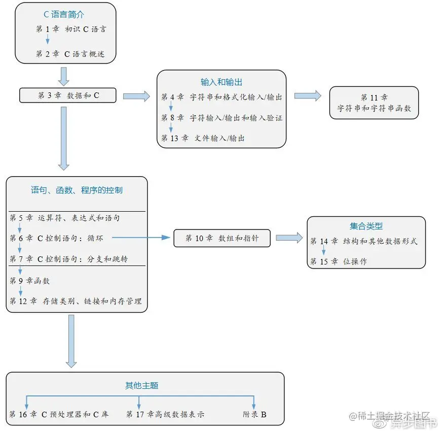 2章),大致了解C语言的历史和基本特性。再根据自身的具体情况和兴趣,有针对性地阅读第二部分(第315章)和第三部分(第16~17章)的内容,对比哪些特性是C语言特有的,哪些特性是其他语言共有的。 - 如果之前学过C语言,长时间不用遗忘或生疏了,可快速阅读第一部分和第二部分,查缺补漏。如果对一些高级主题感兴趣,可研读第三部分和附录B参考资料。