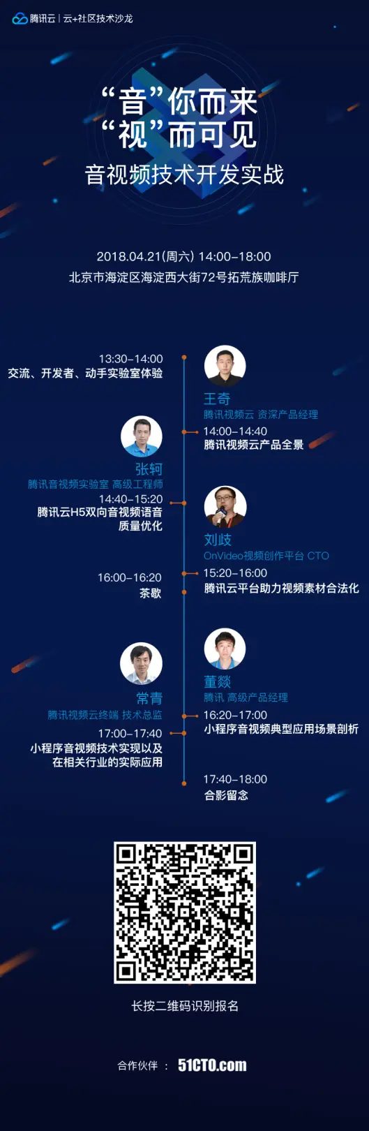 本期云+社区技术沙龙将从视频云行业未来趋势讲起,涵盖小程序音视频技术实现以及在相关行业的实际应用,腾讯音视频在会议场景的应用实践,腾讯云H5双向音视频语音质量优化等等,旨在提供与众多音视频开发者交流与动手体验的机会。