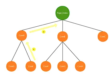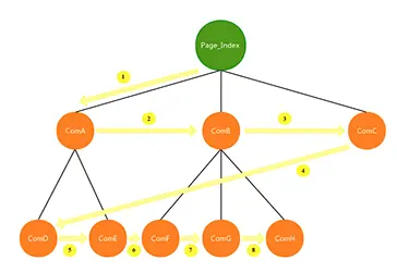 $broadcast事件是由父组件发起,所有子组件都会收到此广播事件,除非事件被手动取消。事件广播的顺序为广度优先搜索顺序,如上图,如果页面Page_Index发起一个$broadcast事件,那么按先后顺序依次接收到该事件的组件为:ComA、ComB、ComC、ComD、ComE、ComF、ComG、ComH。如下图