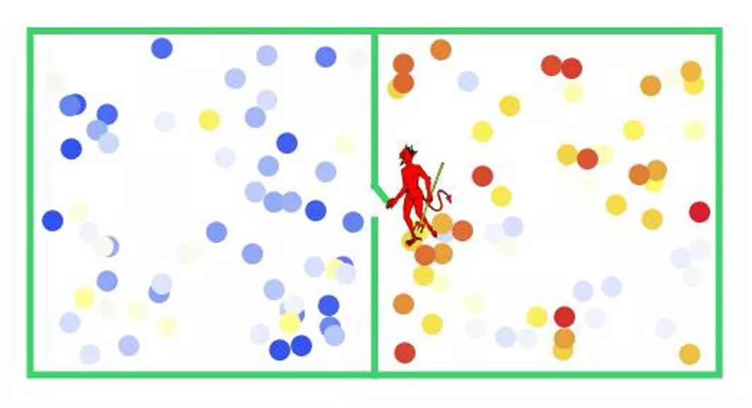 于是,麦克斯韦假设存在一种智能体:麦克斯韦妖,看守暗门,观察分子运动速度。使较快的向某侧流动,较慢向另一侧流动。经过充分长的时间,两侧温差会越来越大 。温度高低是分子运动剧烈程度的宏观表现,通过分隔不同运动速率的分子,就让系统的两个部分的分子有了不同的剧烈程度。