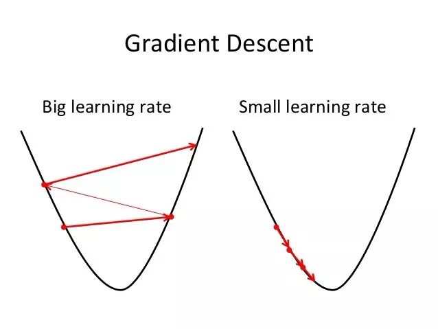 如果设置的学习率过大,步伐太大,一下子跨到对面去了,下次又走导数的反方向跨回来。就这样来来回回地振荡,没有走到一个令人满意的低点。
