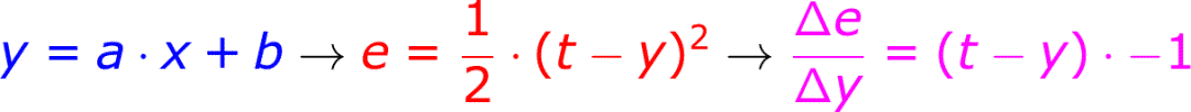 值得一提的是,你可以看到误差 e 对模型输出的 y 的导数,由链式法则计算出来,恰好包含了一个 -1,而找最低点,是用导数的反方向,也包含一个 -1,这相乘就是负负得正,可以消掉。在有些机器学习的介绍公式和代码实现里,它们就省略这两个语义不同的 -1。这对于初学者来说,是非常要不得的。它使得梯度下降的形式,看起来像梯度上升,容易混淆概念,徒增学习难度。