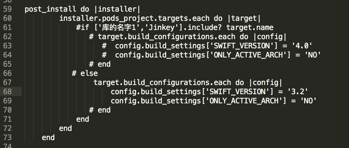 1.这次主要是把主工程的代码切刀swift4,因为有的第三方库并不支持,所以在Podfile文件中要做一定的修改,如下: