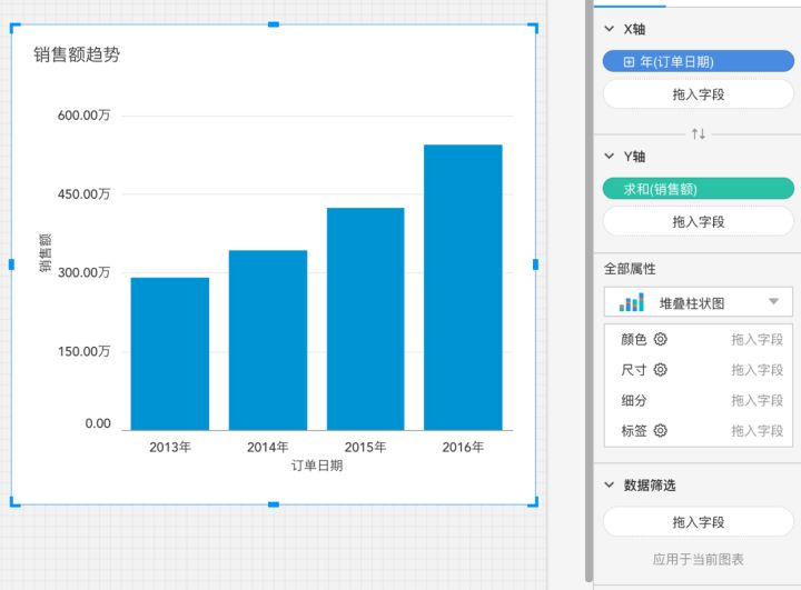 某家电商成立于2013年,有一天数据分析师在利用网易有数做数据分析,首先她想看一下每年销售额的增长情况,于是在有数中,很容易做出了如下的柱状图。她很满意,销售额一直在增长。