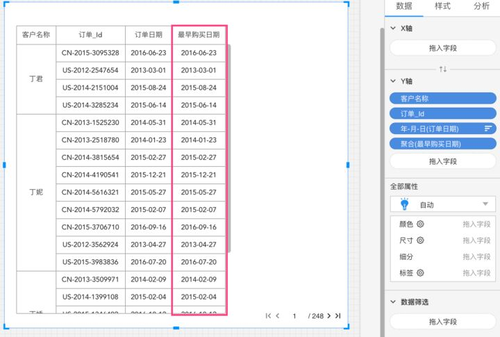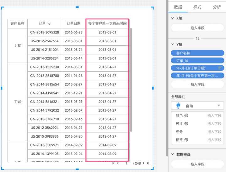 于是她先在有数中做一个简单的表格,把“客户名称","订单ID","订单日期"放入Y轴,得到如下图表。可以看到,丁君这个客户一共买过4个订单,最早的购买日期是"2013-03-01",那我们就可以认为丁君这个客户是2013年的客户。所以我们就其实就是要在有数中计算出每个客户首次购买时间,这样我们就能知道该客户是哪一年的客户了