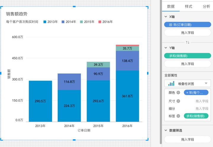 ok,现在万事俱备了,现在只需要将“每个客户首次购买时间”放到颜色栏,就能区分出每一年的销售额里面,有多少是2013年的客户,有多少是2014年的客户,...贡献的