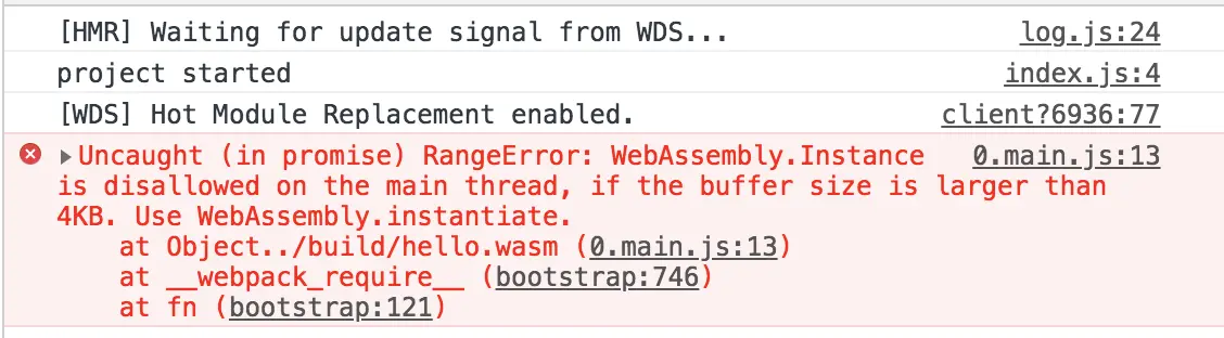 如果 buffer的大小超过了 4KB,WebAssembly.Instance 在主线程中不被允许使用。需要使用WebAssembly.instantiate代替,但是问题来了。