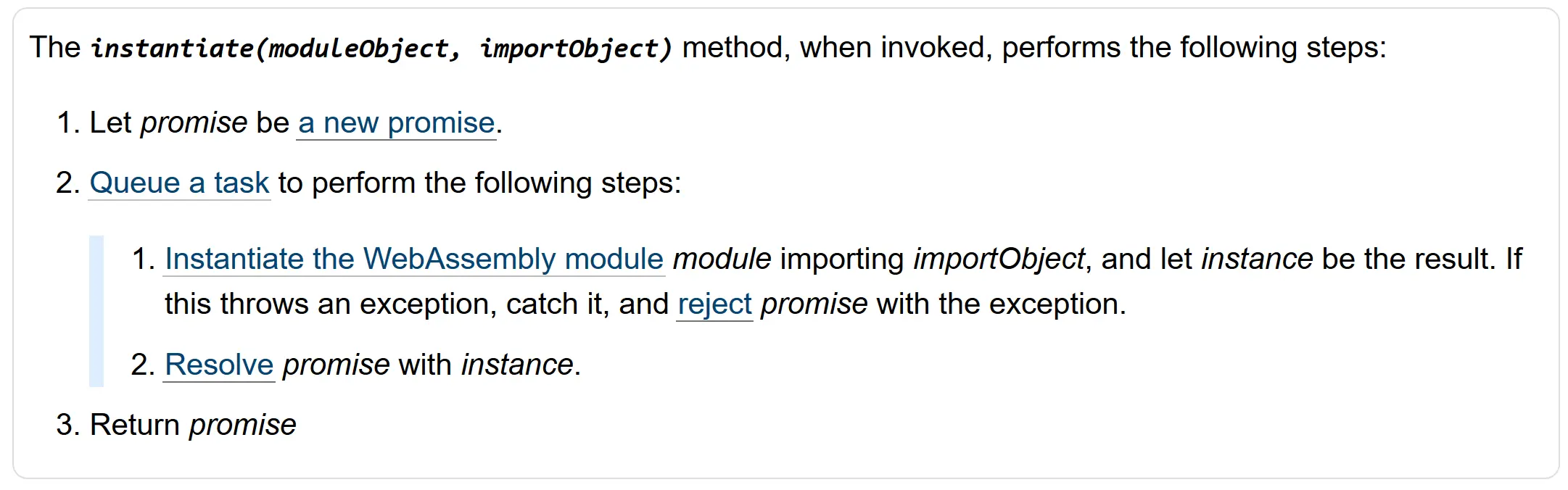 这意味着WASM文件中的imports部分(importsObject)与ESM中的import语句一样被解析,exports部分(instance.exports)被视为像ESM中的export部分。