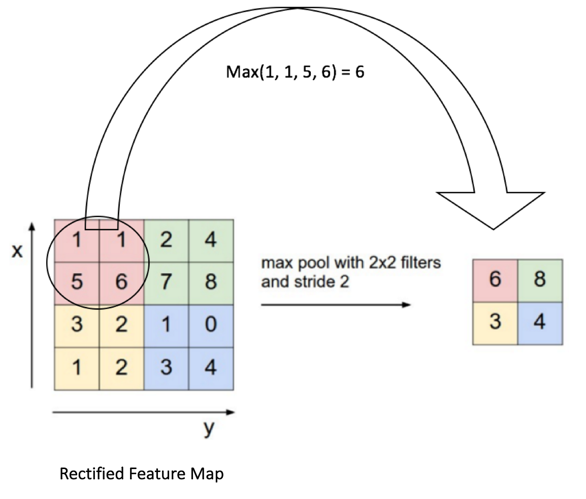 图10展示了通过2 × 2窗口在修正特征映射(卷积+ ReLU 操作后得到)上应用最大池化操作的示例。