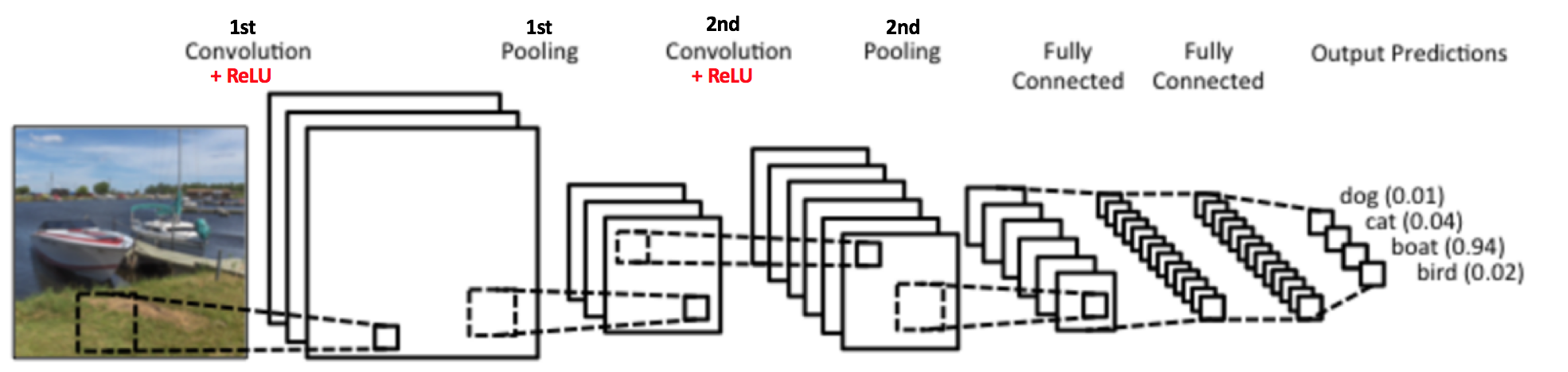 图3中的卷积神经网络在结构上与原始的 LeNet 类似,并将输入图像分为四类:狗,猫,船或鸟(原始的 LeNet 主要用于字符识别任务)。 从上图可以看出,接收船只图像作为输入时,神经网络在四个类别中正确地给船只分配了最高概率值(0.94)。输出层中所有概率的总和应该是1(之后会做解释)。