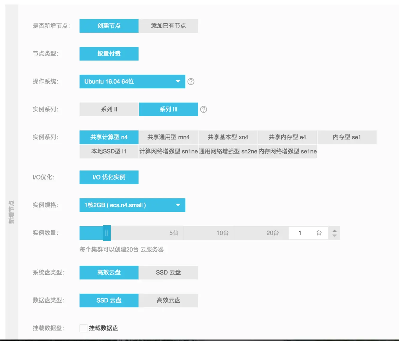 三、选择 创建节点 即 创建新的按量付费ECS,选择 添加已有节点 即 再已经购买的ECS上创建,其他参数,根据自身需求而定。