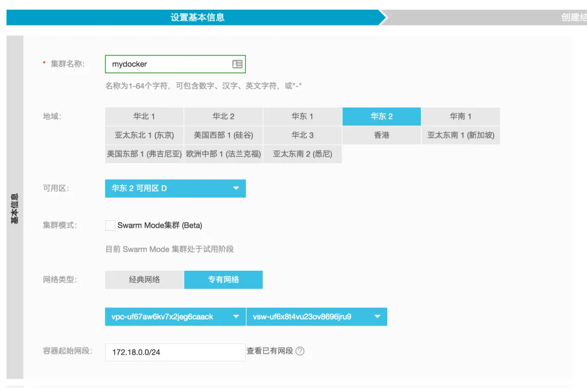二、输入 集群名称 后,选择地域、可用区并选择 网络模式,推荐专有网络
