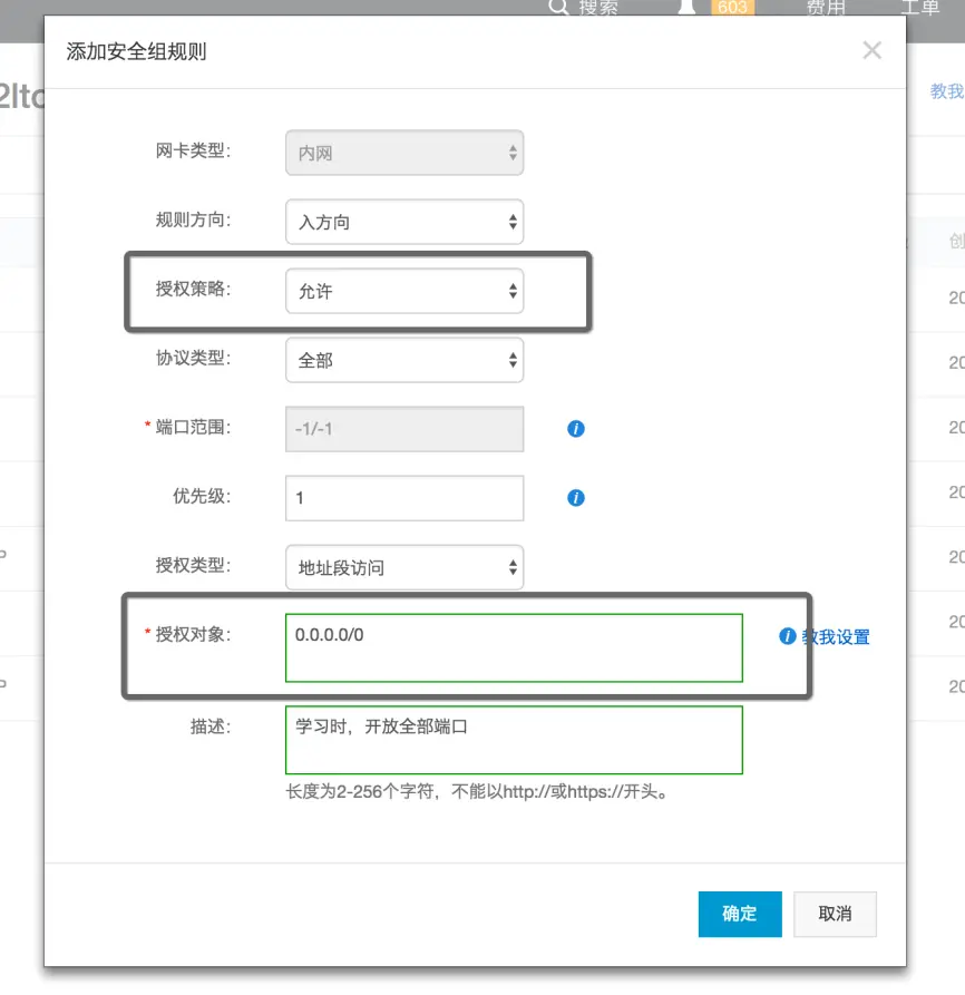 这就是默认开放所有端口且允许所有IP访问了。这是VPC(专有网络)的设置,如果是经典网络,设置公网出入方向的内容即可,不要输入内网的。