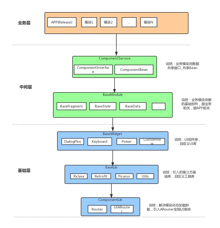 各模块需要共享的实例注入写在BaseModule中。详细的原理我在文章中Android 模块化探索和实践(2):Dagger2实现模块化(组件化)有详细的介绍,这里只就优化点说明一下。