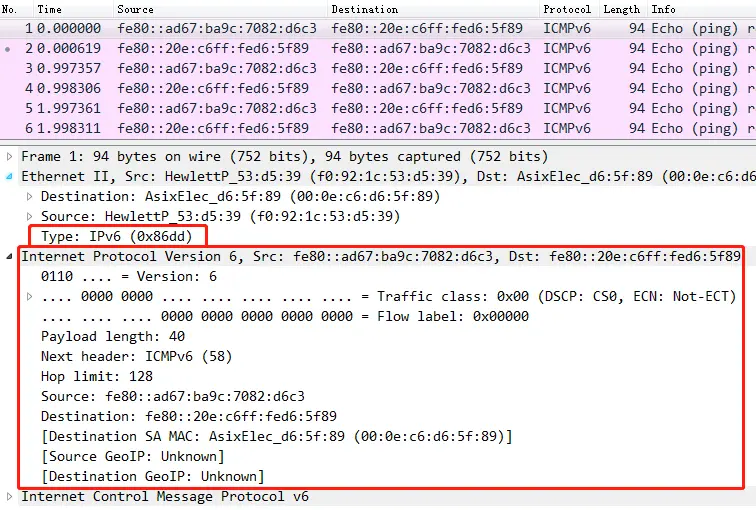 上图是我们最熟悉的ping的IPv6版本ICMPv6。可以看到,IPv6数据报文和IPv4有很大的差别: