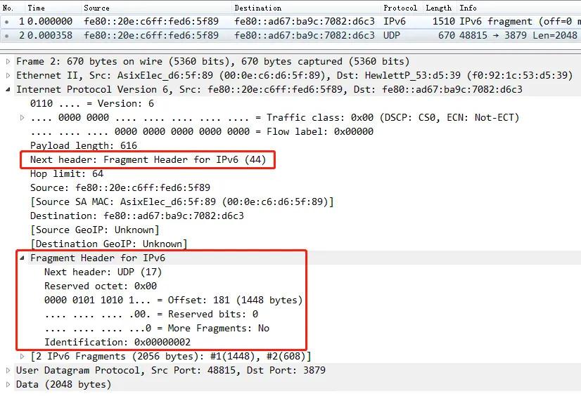 为什么要引入扩展头部这个概念,这里也是IPv6对IPv4改进的一个方面,用扩展头部取代了IPv4的可选项信息,精简了IPv6的头部,增强了IPv6的扩展性。有同学会不会有疑问,IPv6的分片数据报文怎么处理?其实就是使用了IPv6扩展头部。我们来抓一个UDP分片报文来看看。