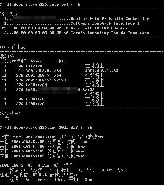 Windows下也可以使用route print -6查看接口列表,列表第一列数字就是scope_id。