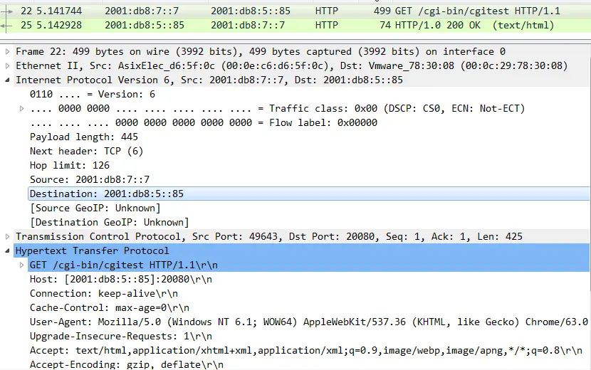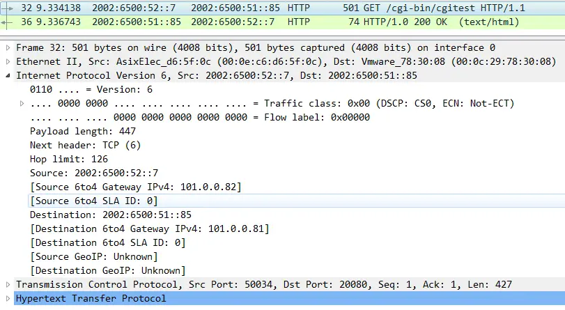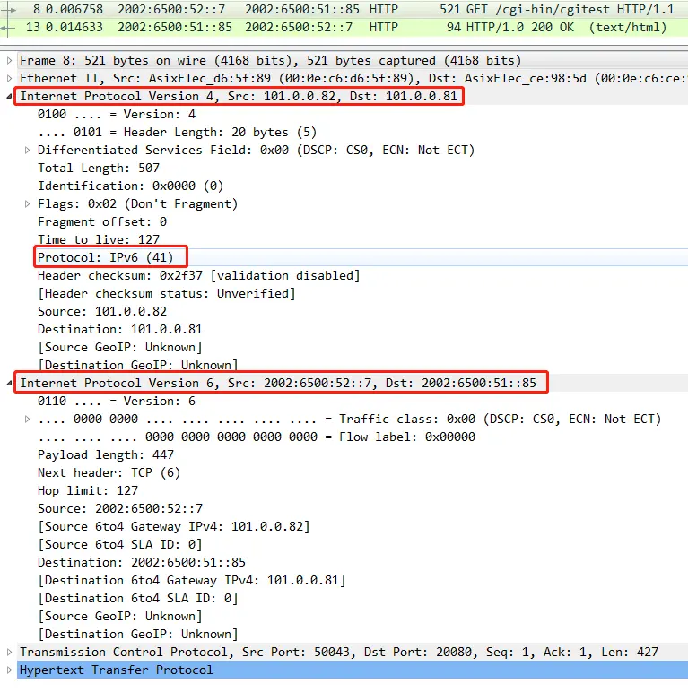 在隧道内抓取http报文,可以看到里面的乾坤。这个不是一般的http报文,它比服务端抓取到的多了一层IPv4报文头部,是隧道的外出通信协议,隧道内层IPv6才是真正的数据。IPv4报文头部中的协议字段,不是我们熟悉的TCP(6)/UDP(17)协议,而是IPv6-in-IPv4专属的隧道协议类型。